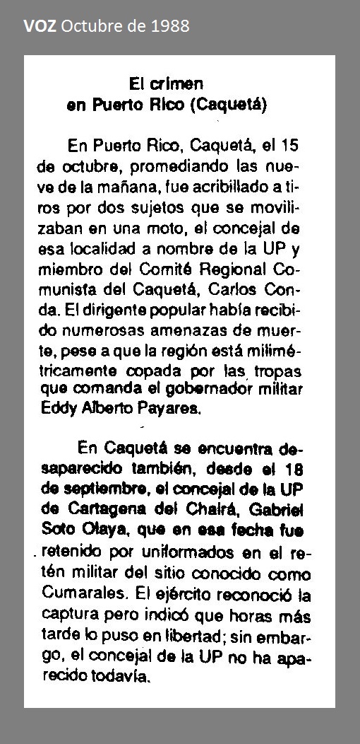 El 15 de octubre de 1988 en Puerto Rico, Caquetá, dos paramilitares que se movilizaban en una moto ejecutaron a CARLOS EVELIO CONDA, concejal de este municipio por la Unión Patriótica y miembro suplente de la Junta Directiva del Sindicato Agrarío del Caquetá. Había recibido amenazas de muerte.