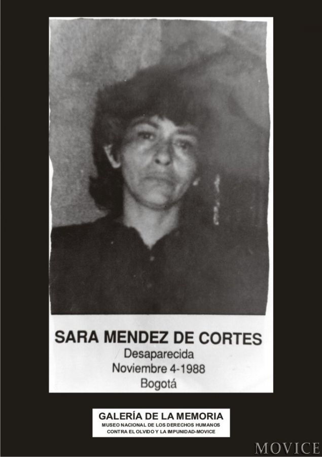 Sara Mendez de Cortés Sara Mendez de Cortés Fuente: MOVICE Edad: Sin información Género: F Fecha: 1988-11-04 Tipo Victima: Desaparición forzada Departamento: D.c. Municipio: Bogotá Presuntos responsables: 1. Sin información Hechos El 4 de noviembre de 1988 en Bogotá, D.C., fue desaparecida SARA MENDEZ DE CORTÉS. ¿Dónde Está? Fuentes: 1. MOVICE Movimiento de Victimas de Crímenes de Estado Información Relacionada 1. MOVICE - SARA MENDEZ DE CORTES.JPG To top