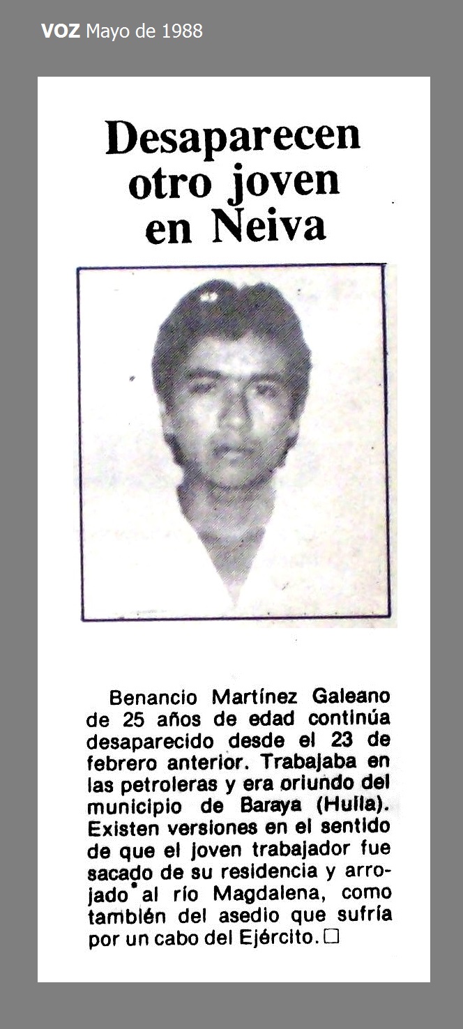 El 23 de febrero de 1989 en Neiva, Huila, el joven trabajador petrolero BENANCIO MARTÍNEZ GALEANO, de 25 años, fue sacado por algunos hombres, al parecer paramilitares, de su vivienda, y desde entonces se encuentra desaparecido. De acuerdo a versiones de sus compañeros de trabajo Benancio venia siendo hostigado por un cabo del Ejército.