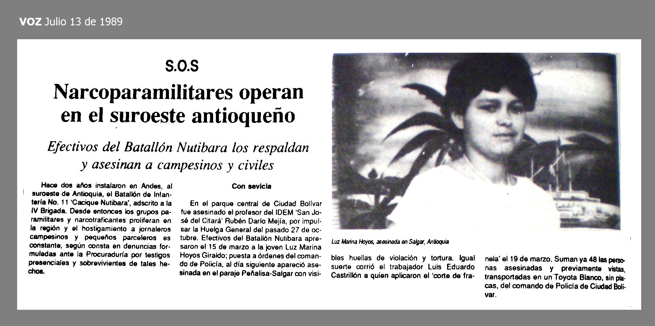 Luis Eduardo Castrillon Luis Eduardo Castrillon Fuente: Edad: Sin información Género: M Profesión: 1. Fecha: 1989-03-19 Tipo Victima: Asesinato Departamento: Antioquia Municipio: Salgar Vereda: Lugar: Presuntos responsables: 1. Ejército (IV Brigada) Hechos El 19 de marzo de 1989 en Salgar, Antioquia, efectivos del Batallón Nutibara asesinaron al trabajador LUIS EDUARDO CASTRILLÓN. A la víctima le fue aplicado el ''corte de franela''. Fuentes: 1. VOZ PROLETARIA Julio 13 de 1989 Información Relacionada 1. VOZ - NARCOPARAMILITARES OPERAN EN EL SUROESTE ANTIOQUEÑO.JPG To top