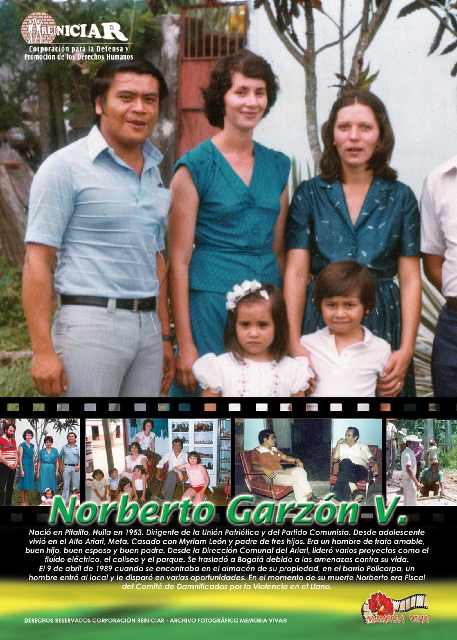 Relata la fuente: "Norberto Garzón nació en Pitalito, Huila, en 1953. Desde adolescente vivió en el Alto Ariari, Meta. Casado con Myriam León y padre de tres hijos. Era un hombre de trato amable, buen hijo, buen esposo y buen padre. Desde la dirección comunal del Ariari lideró varios proyectos como el fluido eléctrico, el coliseo y el parque. Se trasladó a Bogotá debido a las amenazas contra su vida. En el momento de su muerte Norberto era Fiscal del Comité de damnificados por la violencia en el Llano (1).