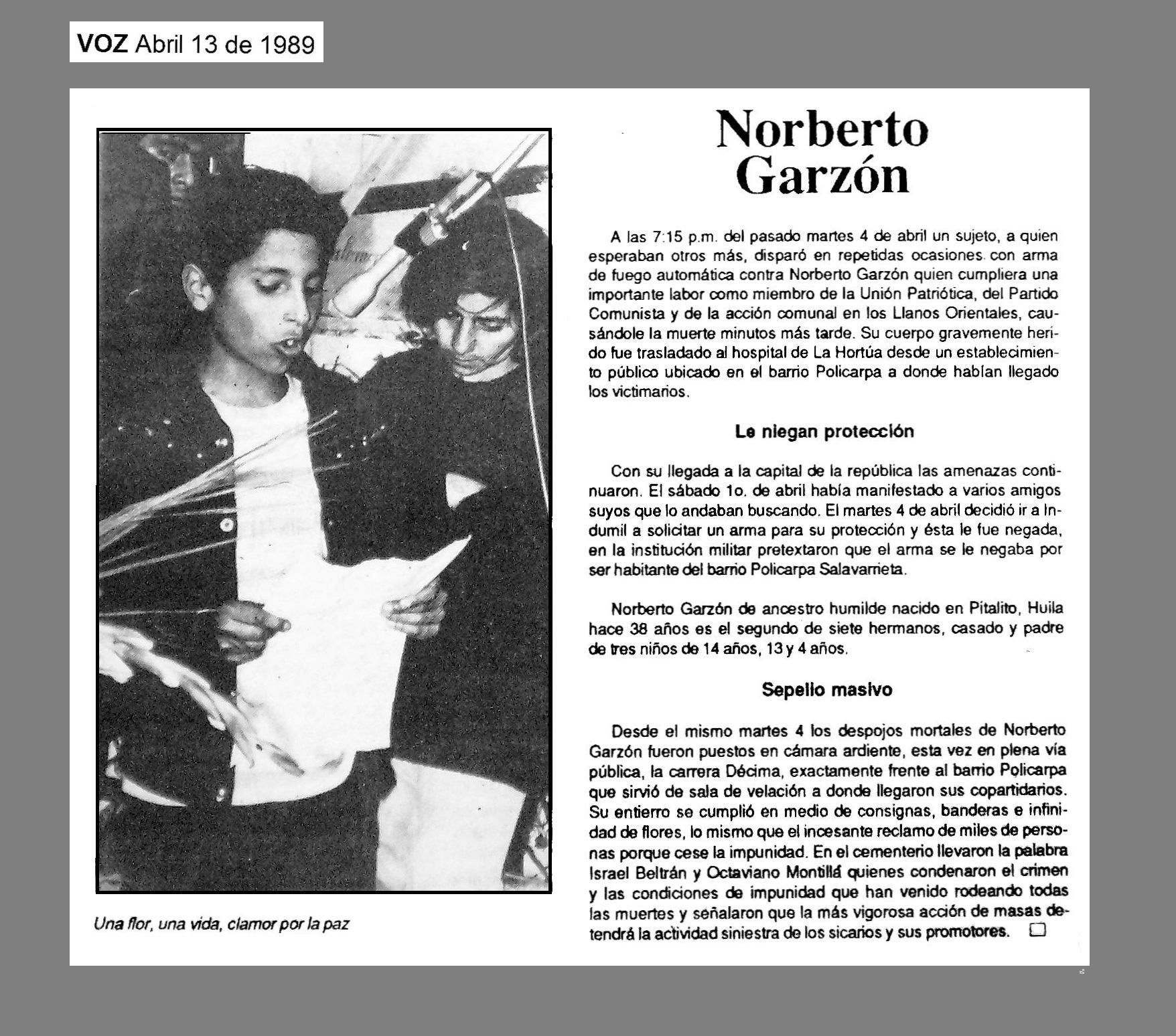 El 9 de abril de 1989 en Bogotá, D. C., el dirigente de la Unión Patriótica y del Partido Comunista en el municipio de El Castillo, Meta, NORBERTO GARZÓN VELÁSQUEZ, 36 años, fue ultimado dentro de un negocio de su propiedad en el barrio Policarpa Salavarrieta, por un sicario que entró al establecimiento y le disparó repetidas veces.