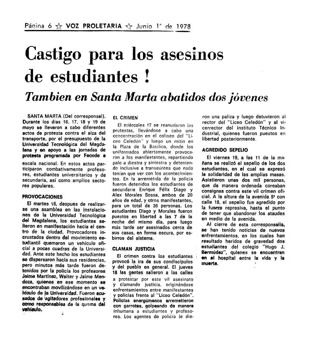 El 18 de mayo de 1978 en Santa Marta, Magdalena, los estudiantes de bachillerato, LUIS ENRIQUE CELIS DIAGO, de 19 años, y JOSE MORALES SOSA, de 17 años, “aparecen muertos en una carretera en las afueras de la ciudad, luego de haber sido detenidos en la tarde por la policía”.