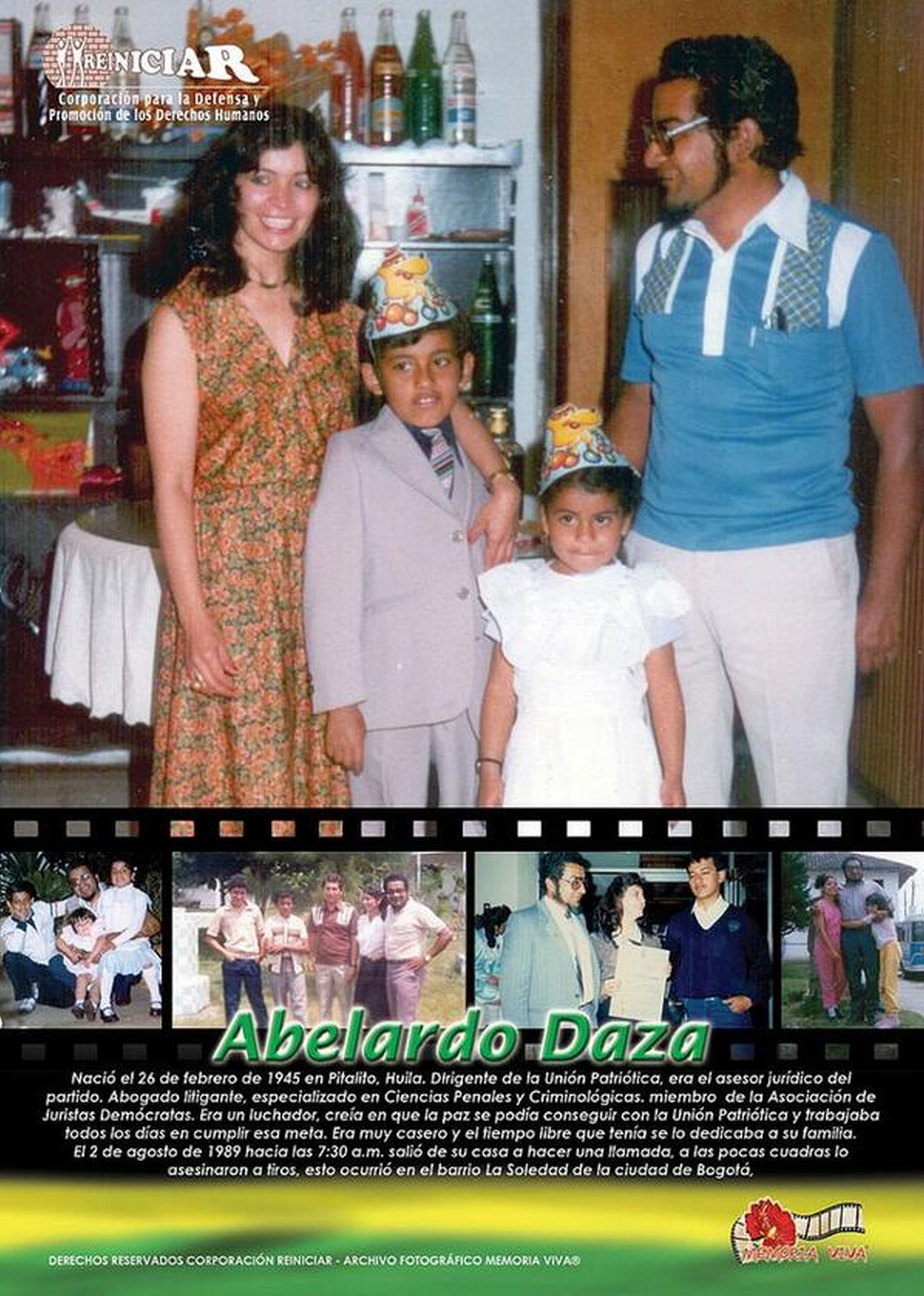Abelardo Daza nació el 26 de febrero de 1945 en Pitalito, Huila. Militante del Partido COmunista y Dirigente de la Unión Patriótica, era asesor jurídico del partido. Abogado litigante, especializado en Ciencias Penales y Criminológicas, integrante de la Asociación Nacional de Juristas Demócratas y miembro del CPDH Comité Permanente por la Defensa de los Derechos Humanos. Fue candidato al Senado en el Departamento del Caquetá de donde había salido por las múltiples amenazas a su vida.