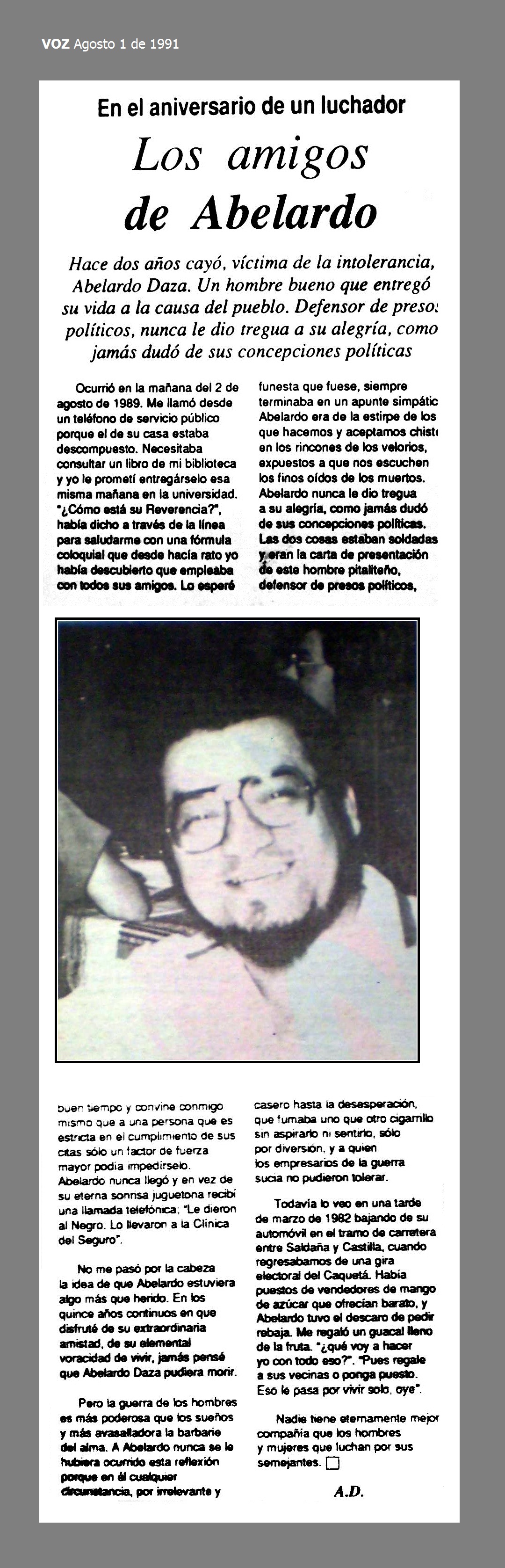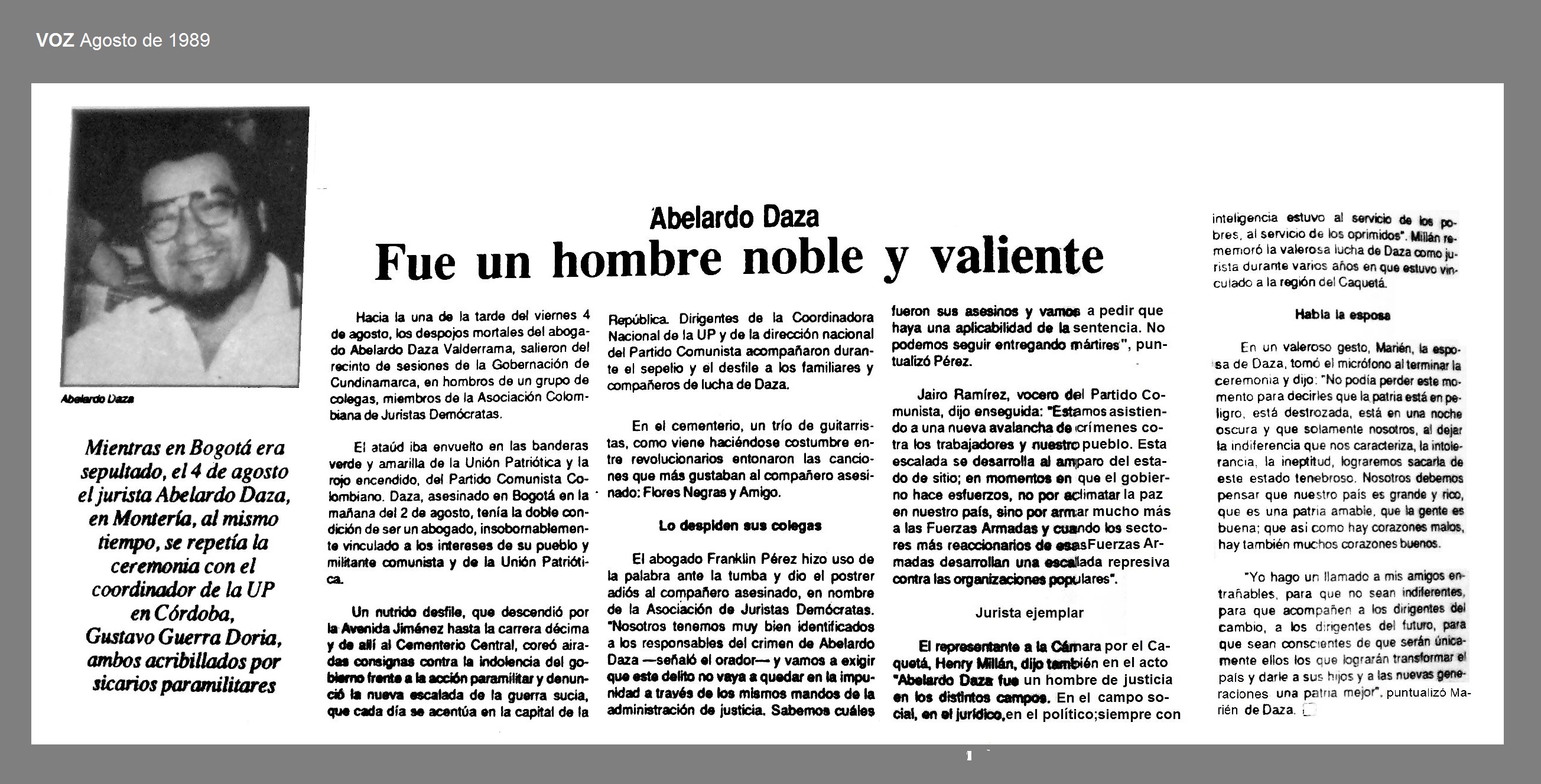 El 2 de agosto de 1989 en Bogotá, D.C., sicarios paramilitares balearon cuando salía de su casa de habitación en el barrio La Soledad a ABELARDO DAZA VALDERRAMA, a las 7:30 a.m. Murió en la Clínica San Pedro Claver.