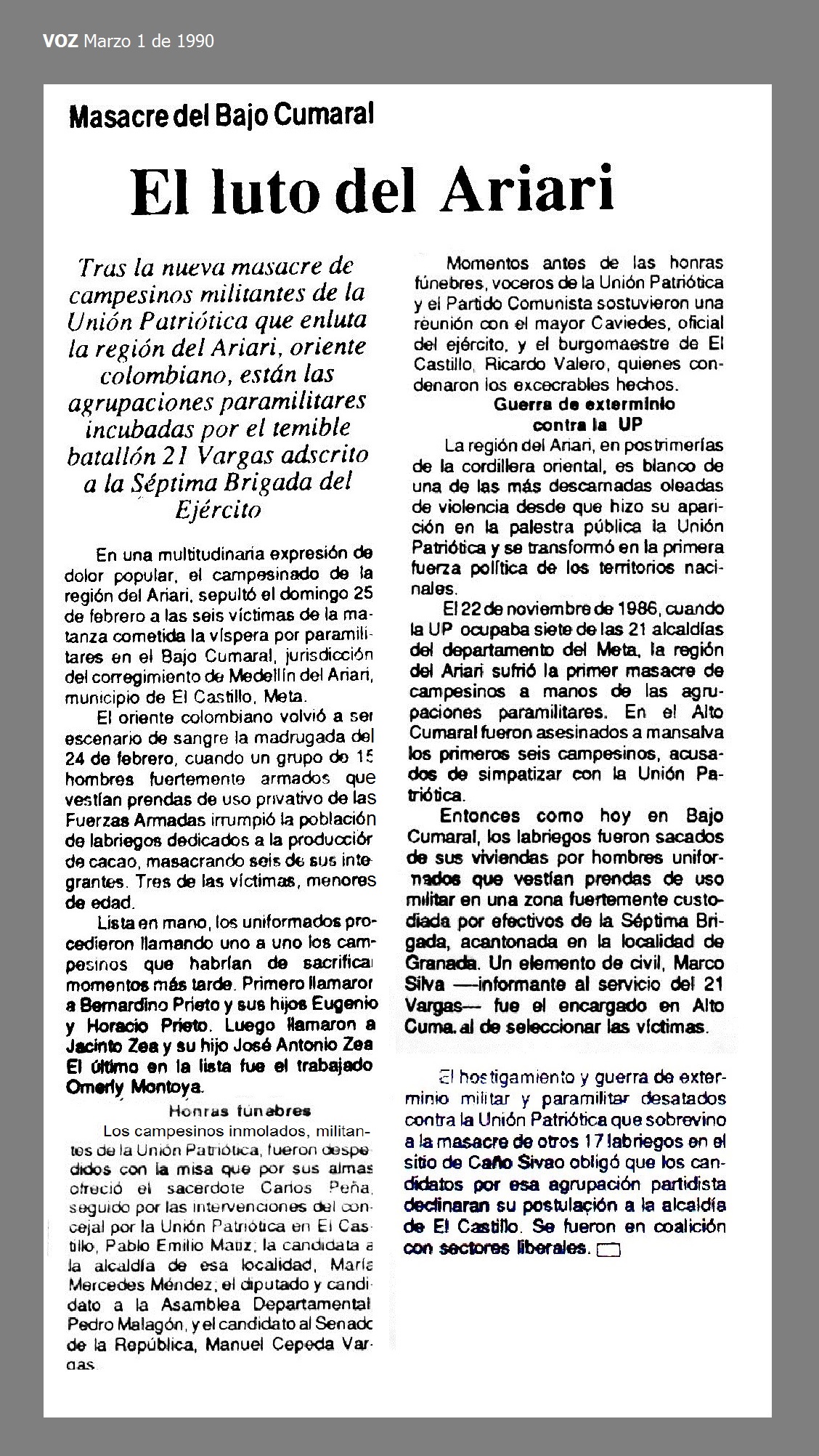 El 24 de febrero de 1990 en El Castillo, Meta, los campesinos y militantes de la Unión Patriótica: JACINTO ZEA, de 60 años, aserrador y dirigente comunal, BERNARDINO PRIETO, de 55 años, cultivador de cacao y dirigente comunal, y los jóvenes HORACIO PRIETO, EUGENIO PRIETO, hijos de Bernardino; UMERLY MONTOYA, trabajador agrario, y JOSÉ ANTONIO ZEA, hijo de Jacinto, fueron asesinados por paramilitares en la vereda Bajo Cumaral, inspección departamental Medellín del Ariari.