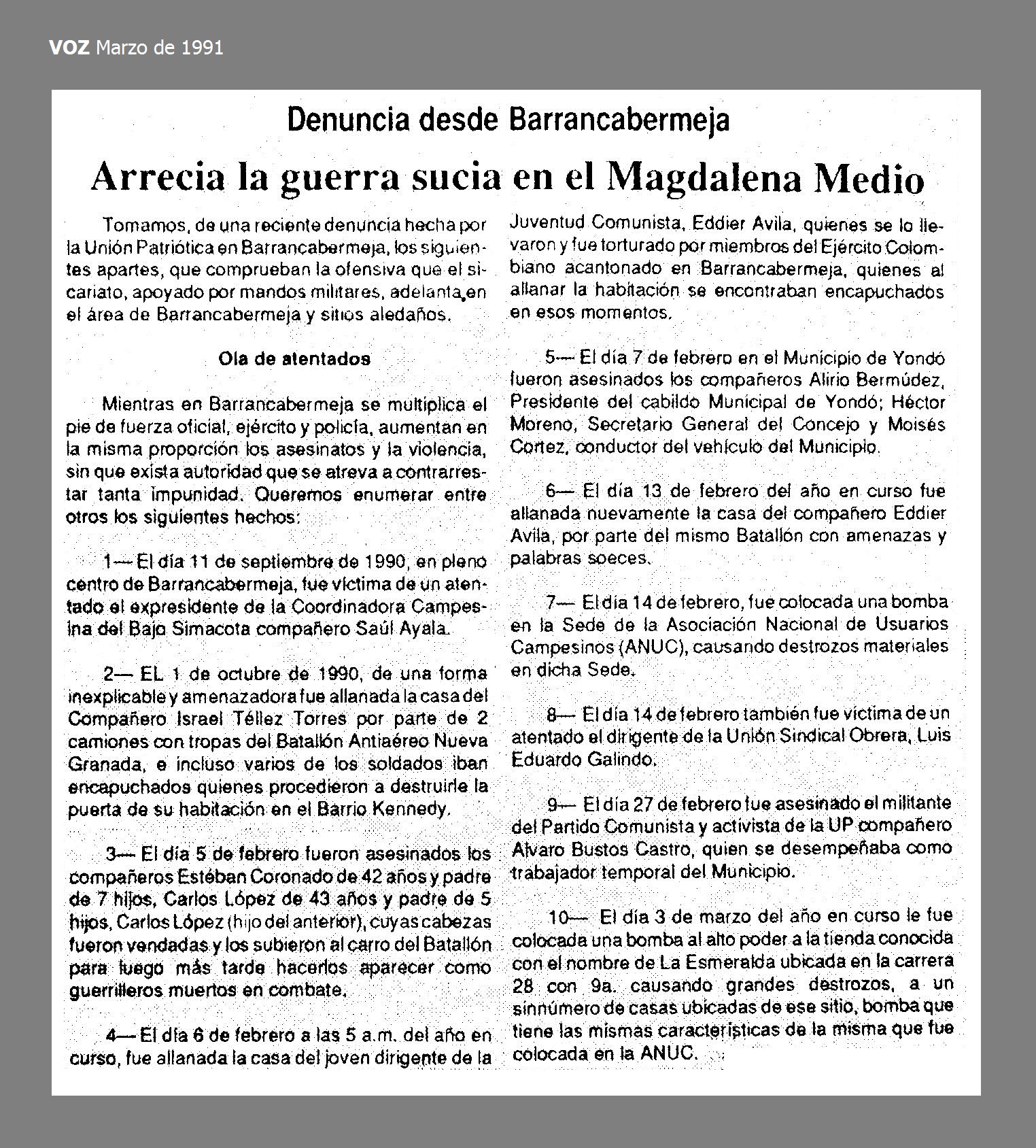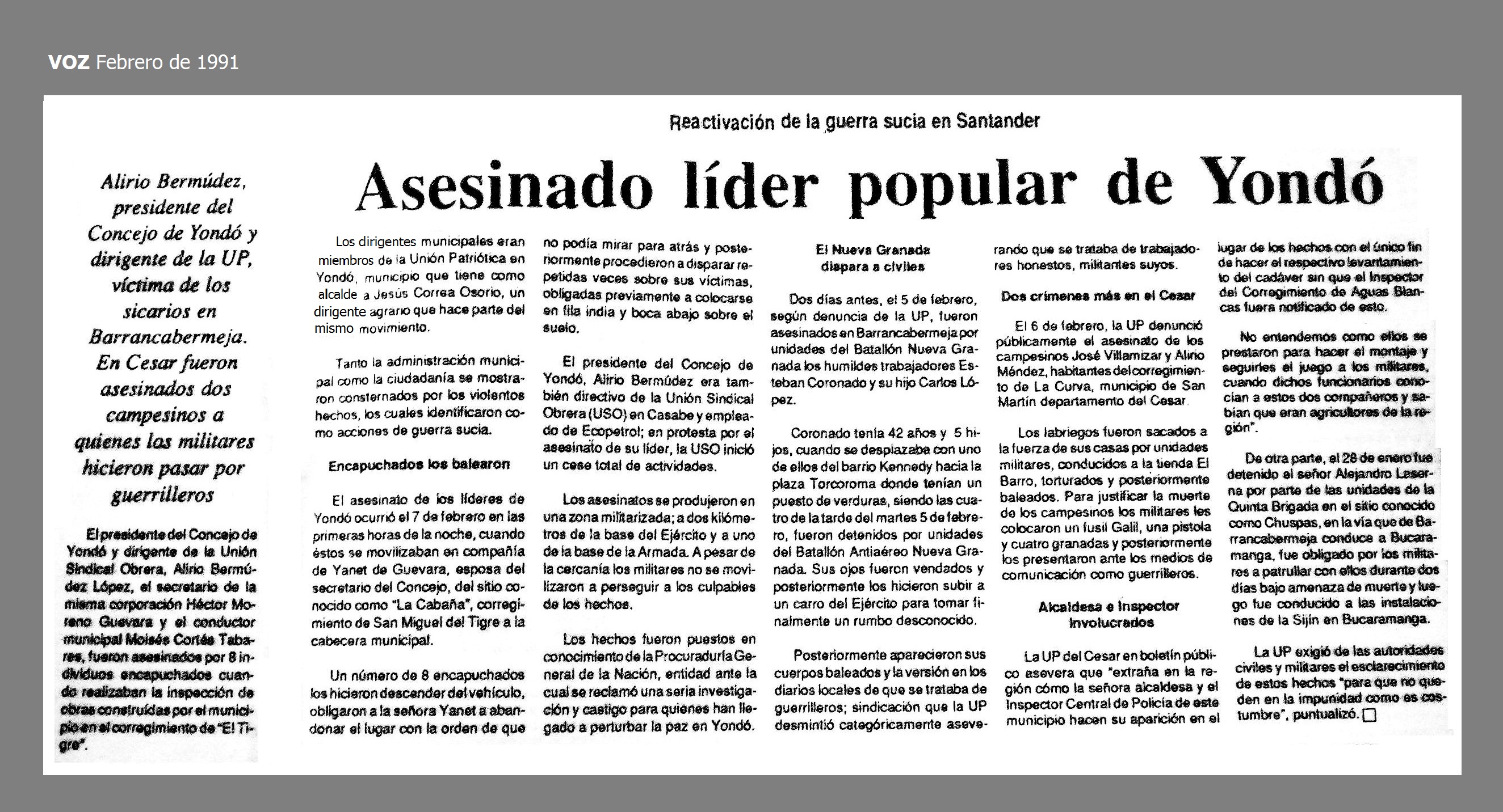 El 5 de febrero de 1991 en Barrancabermeja, Santander, los militantes de la Unión Patriótica y vendedores en la plaza de mercado de la ciudad, CARLOS LOPEZ RODRIGUEZ, su hijo de 15 años CARLOS LOPEZ MARCELO y ESTEBAN CORONADO, fueron detenidos en la madrugada en el barrio Torcoroma, por militares adscritos al Batallón Nueva Granada que los sindicaron de pertenecer a la guerrilla. Los detenidos fueron vendados y trasladados al sector Nororiental de la ciudad, específicamente barrio Kennedy, donde fueron asesinados y sus rostros desfigurados con ácido. Según testigos las personas detenidas fueron dejadas en libertad y mientras que los demás fueron asesinados.