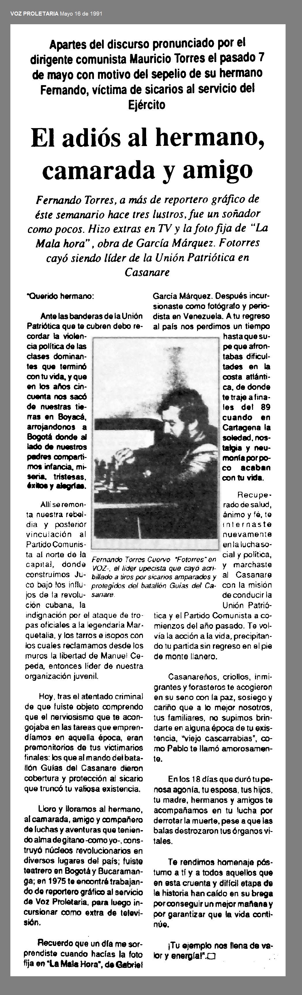 Fernando Torres murió después de 18 días de agonía. Era líder social y político, fue teatrero en Bogotá y Bucaramanga, en 1975 trabajó como reportero gráfico al servicio de Voz Proletaria y luego incursionó como extra de televisión (Fuente: EL ADIÓS AL HERMANO, CAMARADA Y AMIGO - Voz Proletaria, Mayo 16 de 1991)