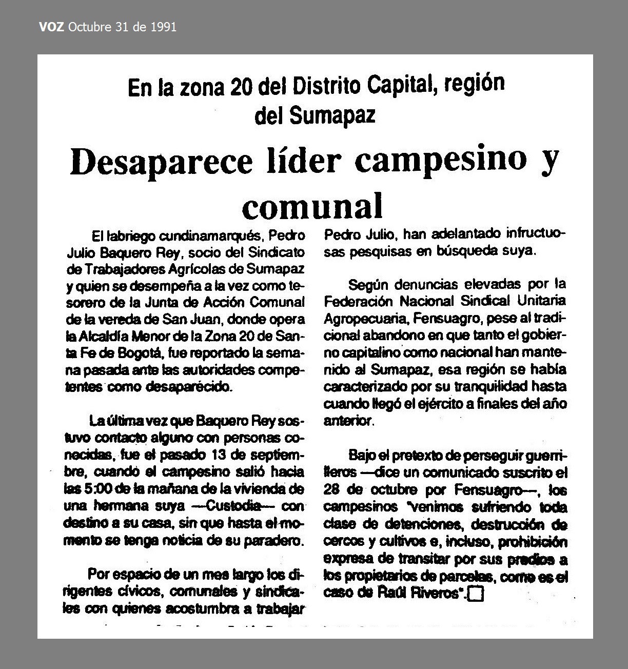 El 13 de septiembre de 1991 en Bogotá, D.C., el labriego PEDRO JULIO BAQUERO REY, socio del Sindicato de Trabajadores Agricolas de Sumapaz, salió hacia las 5:00 de la mañana de la vivienda de una hermana suya –Custodia- con destino a su casa, en la vereda San Juan, sin que hasta el momento se tenga noticia de su paradero. Por espacio de un mes largo los dirigentes cívicos, comunales y sindicales con quienes acostumbra a trabajar Pedro Julio, han adelantado infructuosas pesquisas en búsqueda suya. El labriego se desempeñaba a la vez como tesorero de la Junta de Acción Comunal de la vereda, donde opera la Alcaldía Menor de la Zona 20 de Santafé de Bogotá.