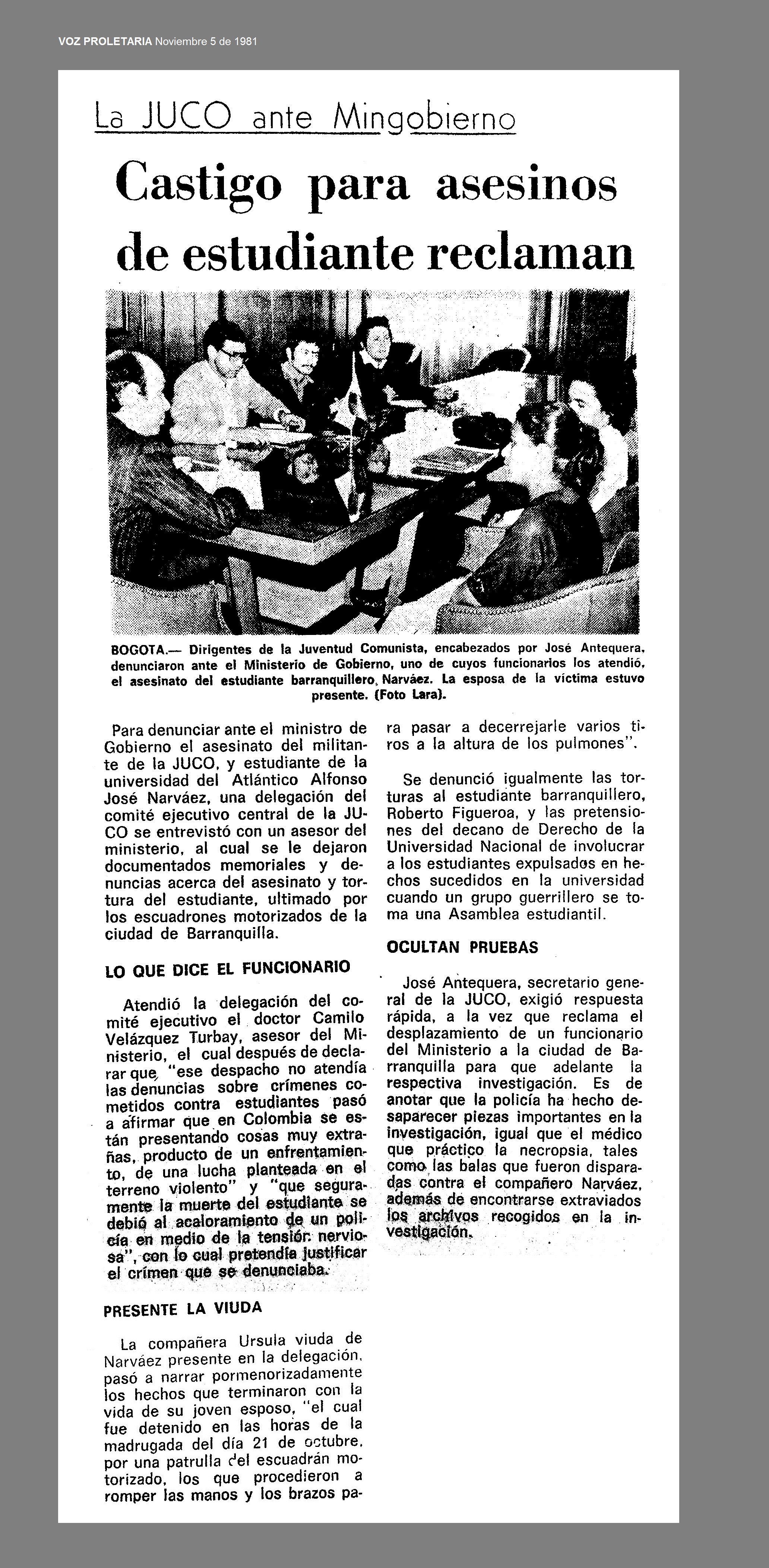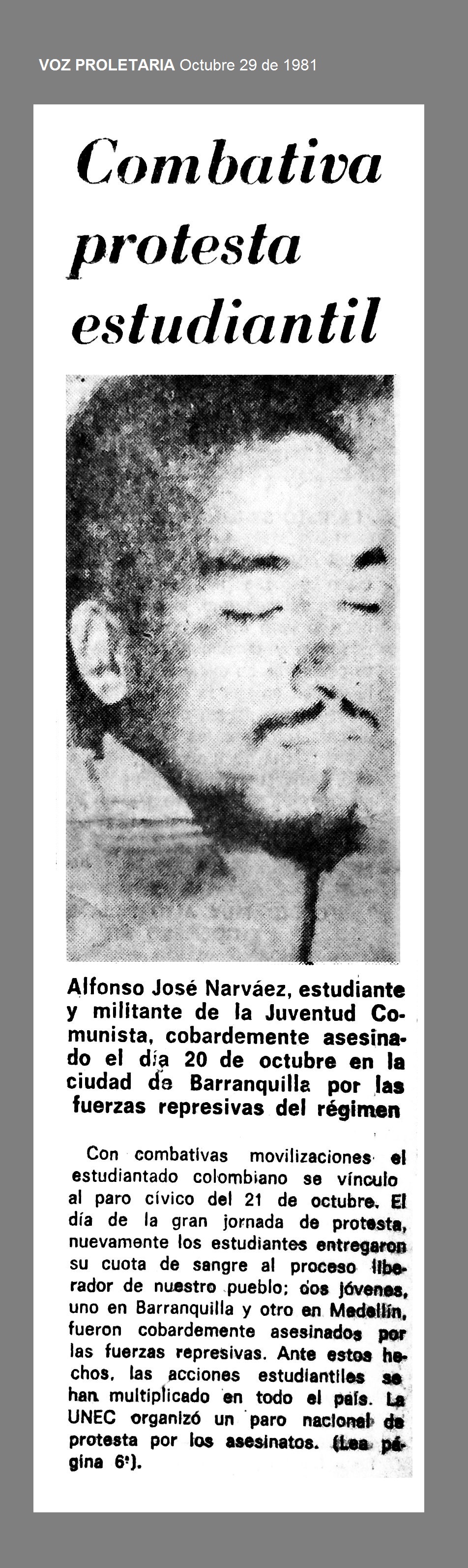 El 20 de octubre de 1981 en Barranquilla, Atlántico, fuerzas represivas del régimen asesinaron a ALFONSO JOSÉ NARVÁEZ HERNÁNDEZ, estudiante de la Universidad del Atlántico y militante de la Juventud Comunista. El cadáver del joven fue hallado el 21 de octubre, a las tres de la madrugada, en un solar del barrio Villate. Registraba impactos de bala en la espalda y la cabeza, así como fracturas en ambas manos. Los signos de tortura eran muy claros y todo indicaba que había sido fusilado impunemente.